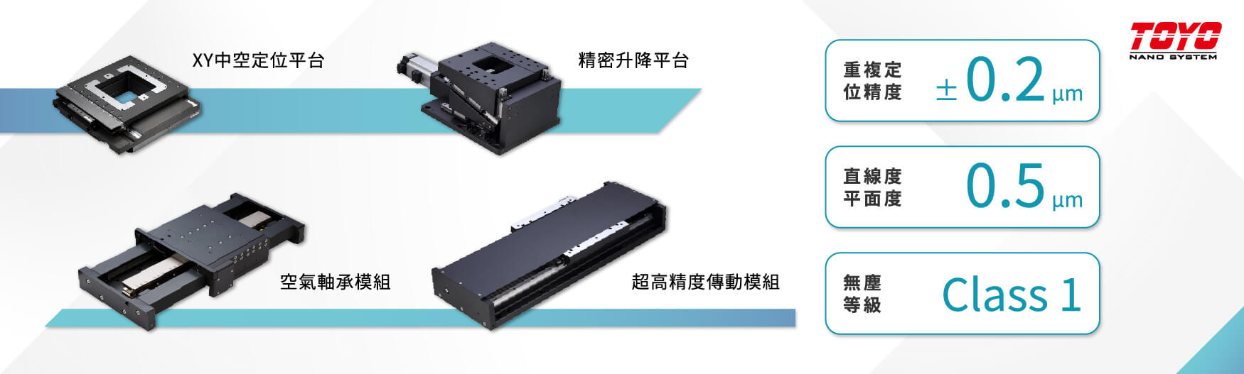 東佑達奈米系統(TOYO NANO SYSTEM)創立於2012年,專注於精密運動定位平台的研發和製造,不斷進行研發以提高產品的穩定性和精準度。其空氣軸承平台在線性精度、平面度、直線度、直交度、Pitch、Yaw以及速度瀲波等方面表現出色,與日本、歐美等頂尖品牌並駕齊驅。不僅為台灣的精密機械產業帶來了更多選擇,同時也提升了整個產業的競爭力。